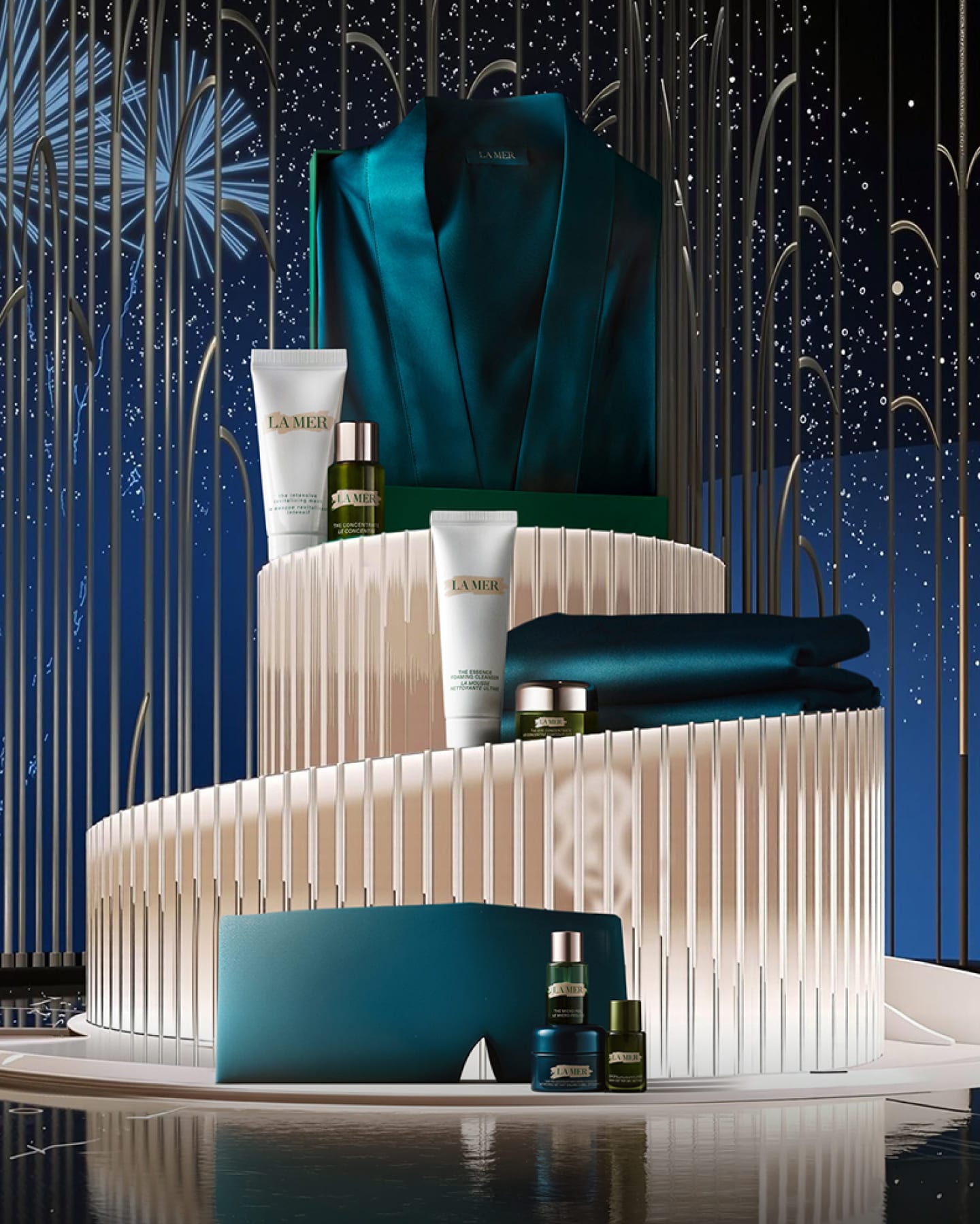 Selection of bestselling La Mer products placed on a festive, grand staircase, decorated in miniature masquerades and headwear